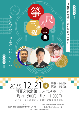 今年度「純邦楽」をテーマに「川西音故知新」を企画しています。これまで「和太鼓」、「津軽三味線」の公演を行い、日本の伝統音楽の魅力をお届けしてきました。今回は、その締めくくりとして「箏」、「三味線」、「尺八」から成る「三曲」のクリスマスコンサートを開催します。菊重絃生氏(箏・三味線)と、村田知早氏(箏)、中坪熊山氏(尺八)をお迎えし、”日本の冬”の曲はもちろん、クリスマス曲も演奏していただきます。是非、この機会に新たな「純日本」を感じてください。