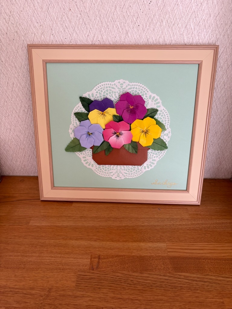 季節を彩る「パンジー」の花を折ってレース飾りの色紙作品を作ります。