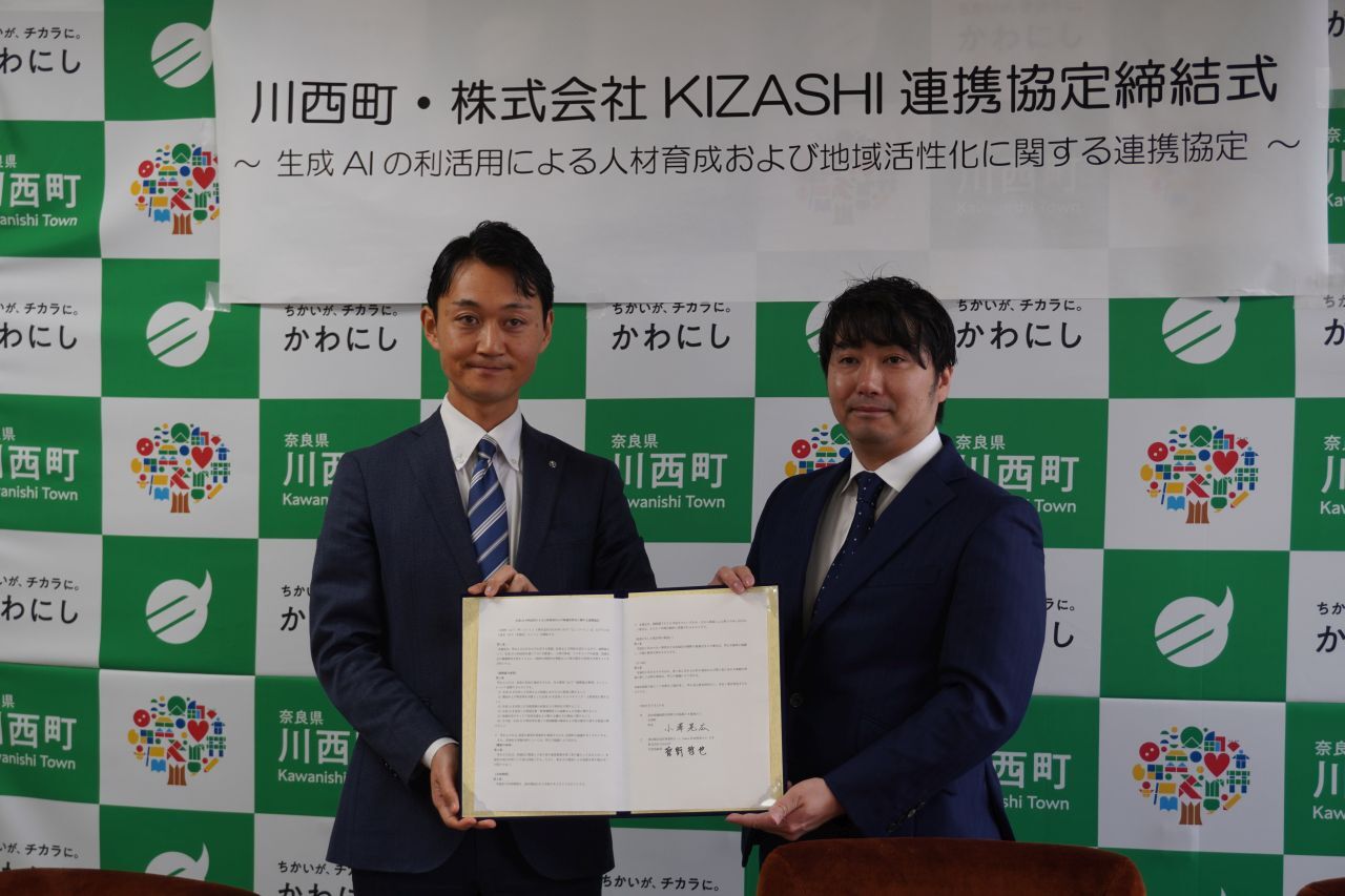 令和 8 年 2 月 26 日(木)、川西町と株式会社KIZASHIで生成AIの利活用による人材育成および地域活性化に関する連携協定を締結しました。