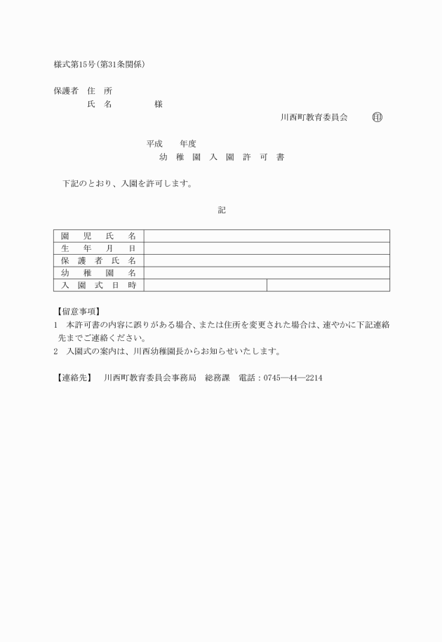 第31条 委員会は幼児の心身の発育状態を考慮して入園許可書(様式第15号)により保護者に通知しなければならない。