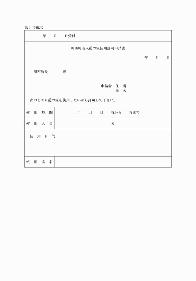 第1条 この規則は、川西町老人憩の家設置及び管理に関する条例(昭和47年条例第10号。以下「条例」という。)第5条の規定に基づき川西町老人憩の家(以下「憩の家」という。)の管理について必要な事項を定めることを目的とする。