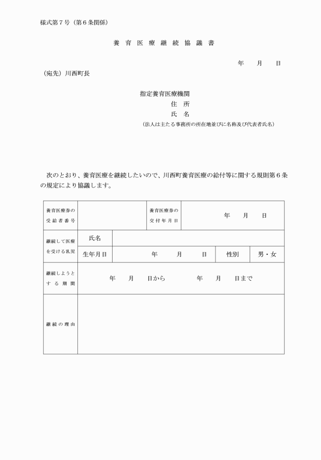 第6条 指定養育医療機関は、養育医療券の有効期間を超えて養育医療を行おうとするときは、あらかじめ、町長と協議しなければならない。