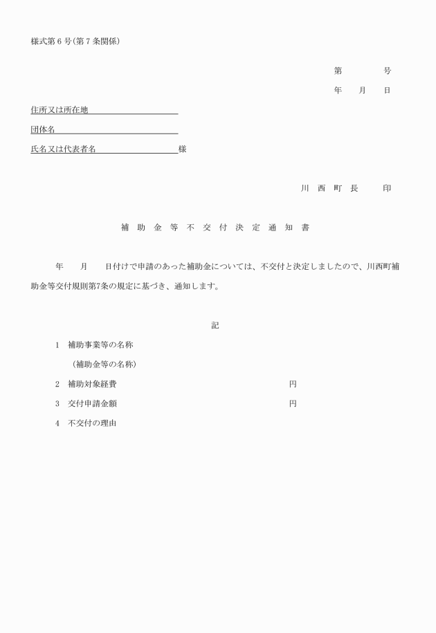 2 町長は、補助金等を交付することが適当でないと認めるときは、速やかにその旨を申請者に対して補助金等不交付決定通知書(様式第6号)により通知するものとする。